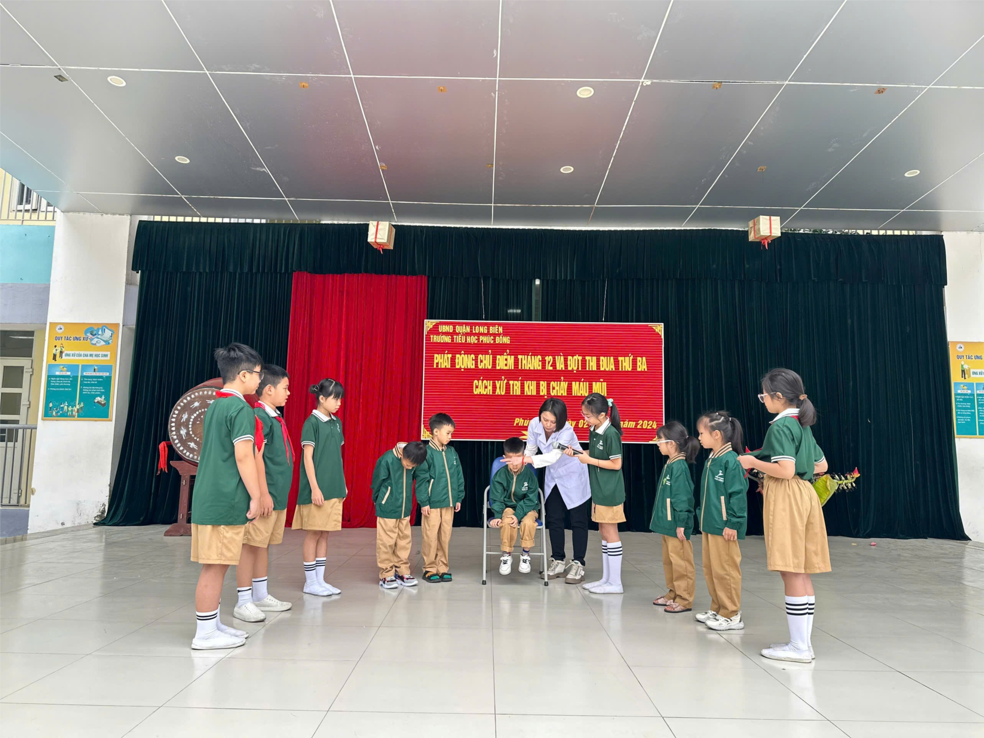 Tiếp nối chương trình cô Nguyễn Thị Thuý – Nhân viên Y tế nhà trường đã lên tuyên truyền cách xử trí khi bị chảy máu mũi tới học sinh toàn trường. Cuối cùng là tiết mục biểu diễn dân vũ lớp 5A.