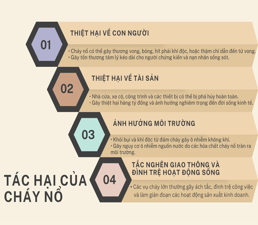 Cháy nổ là một trong những hiểm họa nghiêm trọng gây ra hậu quả khôn lường cho con người, tài sản và môi trường. Một số tác hại chính bao gồm: