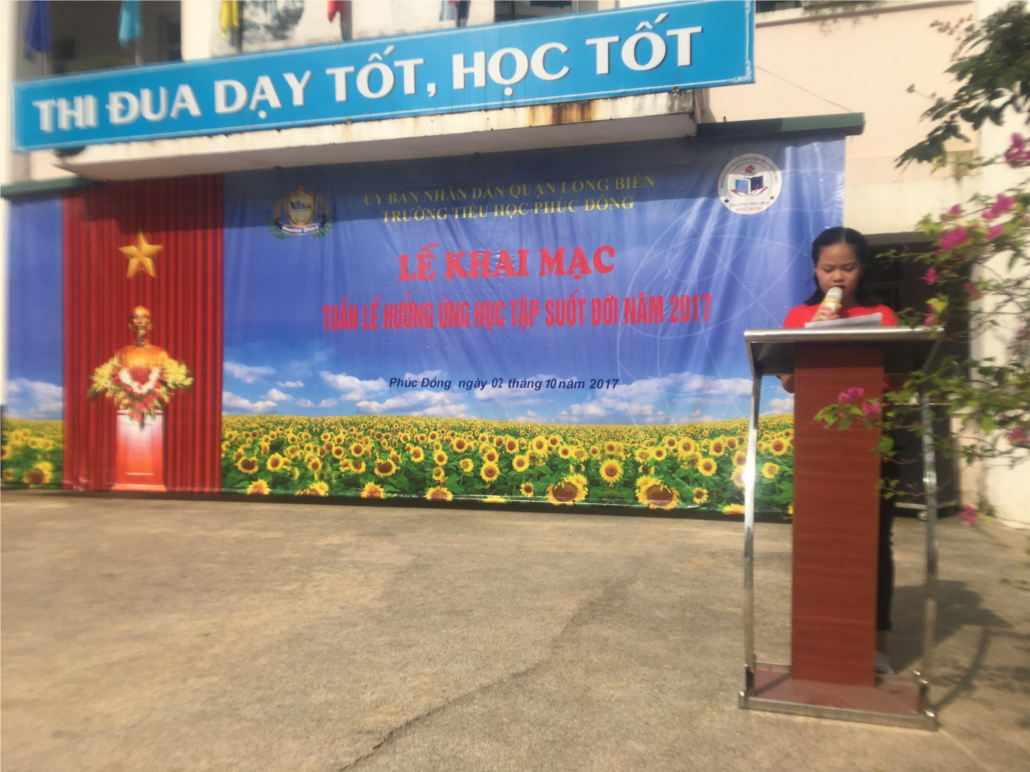 Thực hiện công văn 316/KH-UBND của Ủy ban nhân dân quận Long Biên về việc tổ chức “Tuần lễ hưởng ứng học tập suốt đời” năm 2017, sáng nay, ngày 2/10/2017, trường Tiểu học Phúc Đồng đã tổ chức lễ Phát động Tuần lễ hưởng ứng học tập suốt đời năm 2017 với chủ đề “Học tập để hoàn thiện nhân cách, phát triển bản thân”. Buổi lễ diễn ra trong không khí long trọng vui tươi, phấn khởi với sự có mặt của các thầy cô trong ban giám hiệu, trong hội đồng sư phạm nhà trường và gần 900 học sinh.